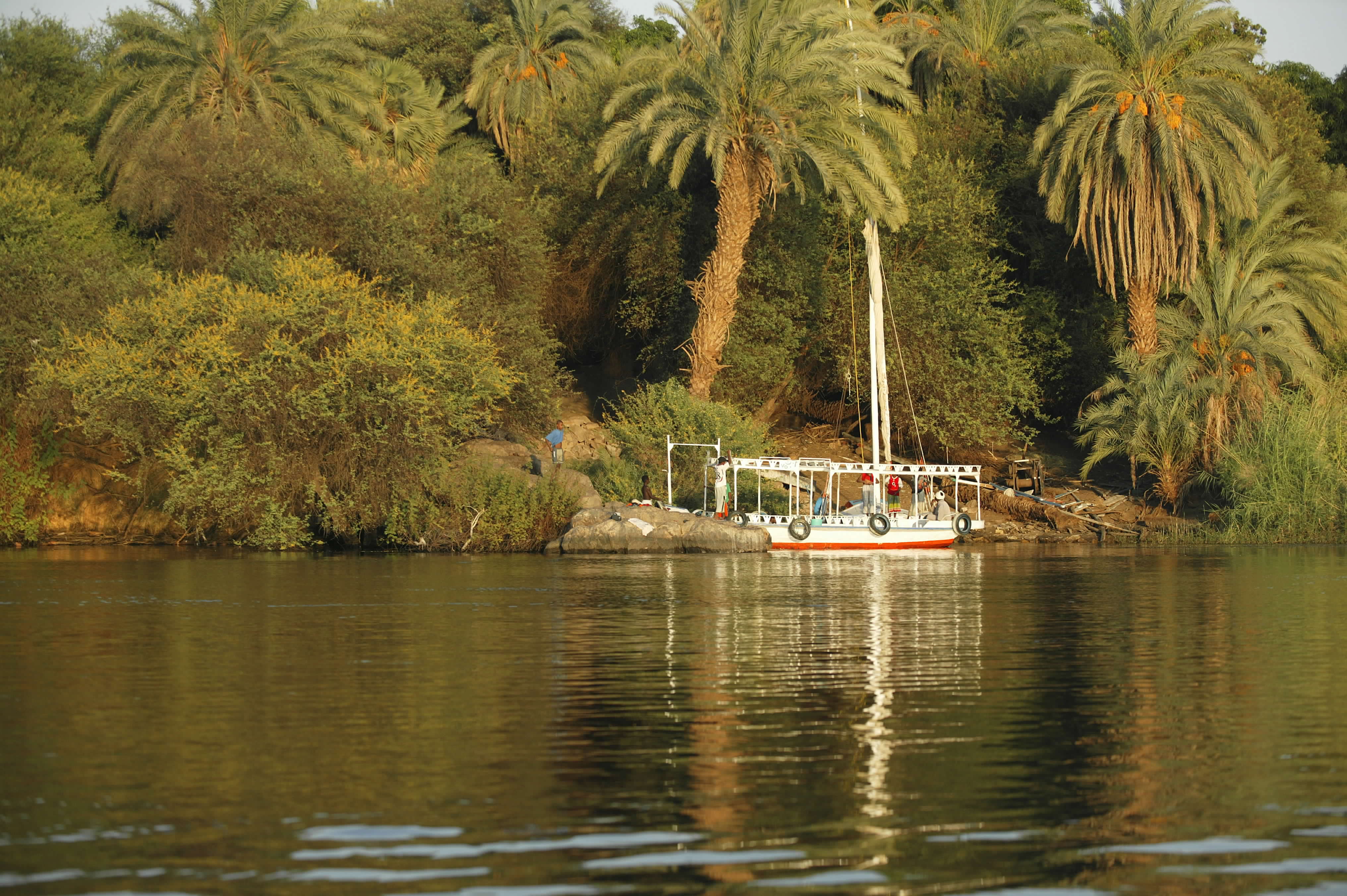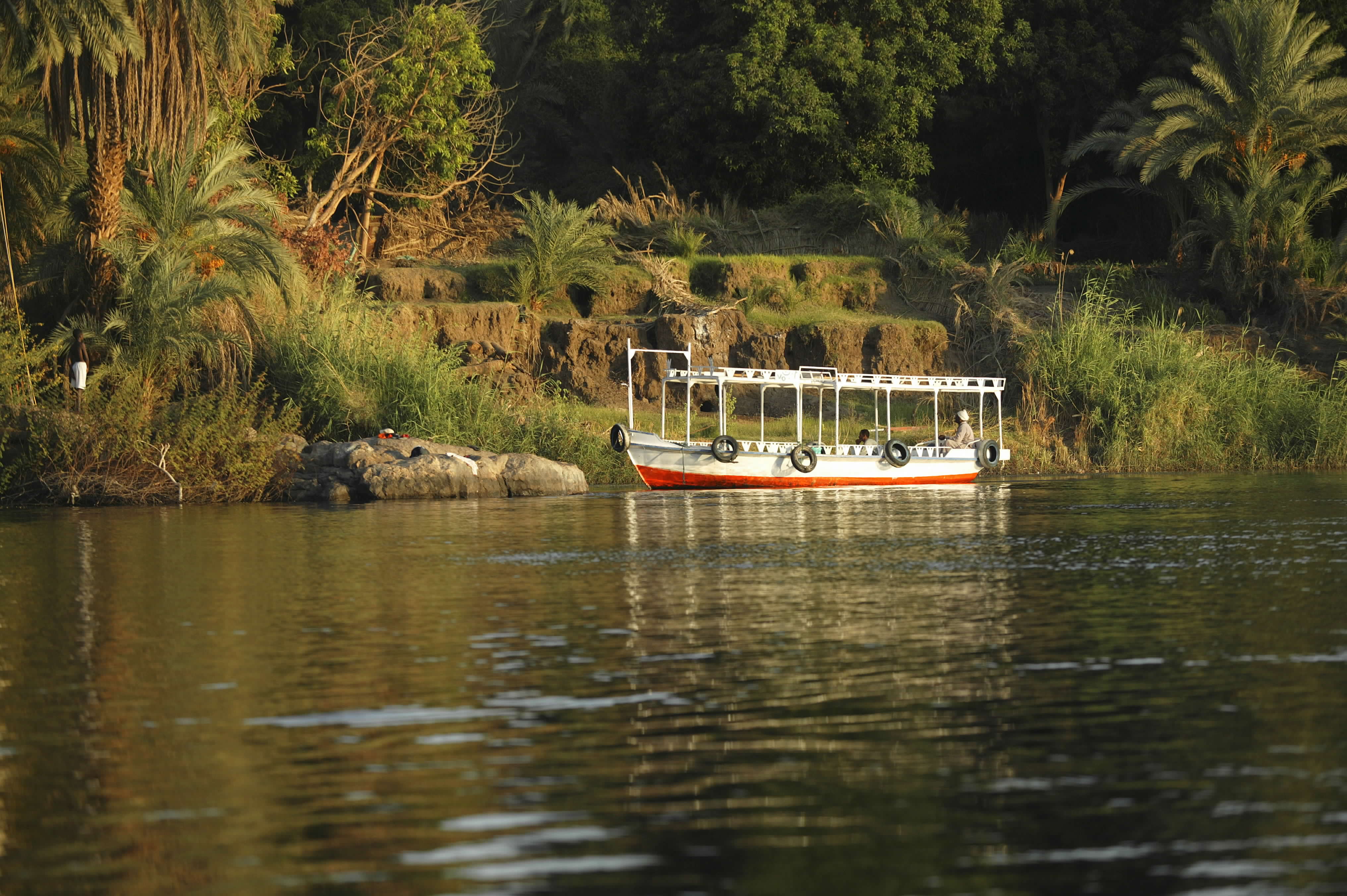 Bâteau à moteur sur le Nil amarré sur l' Ile Eléphantine à Assouan.